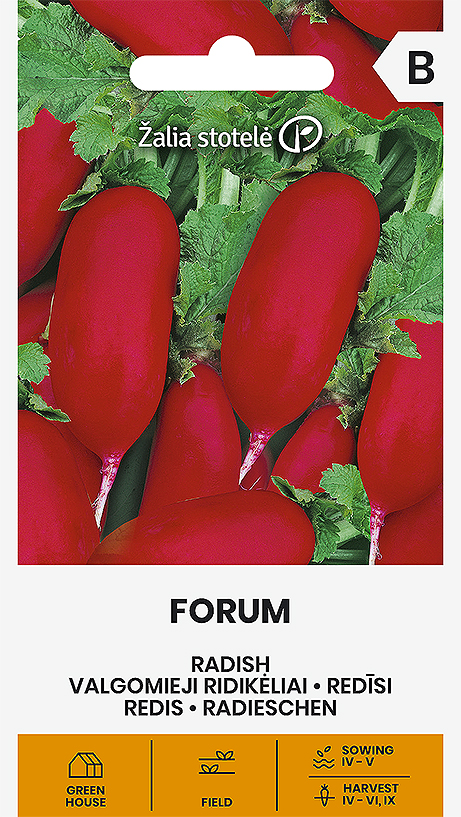 Varajane sort, tärkamisest 30-34 päeva. Kasvatamiseks avamaal (kevadel ja sügisel) ja kasvuhoones (varakevadel). Punane piklik vili, viljaliha valge, mahlane ja mahe. Vastupidav lõhenemisele. Tee külve kevadel ja hilis-suvel (sügisel).